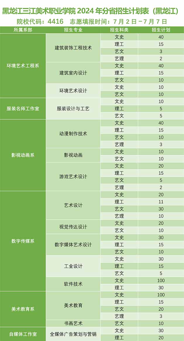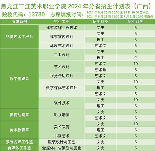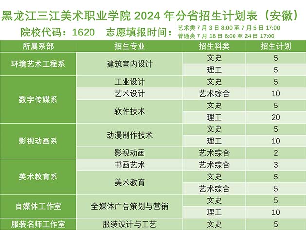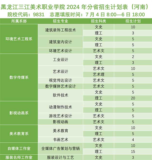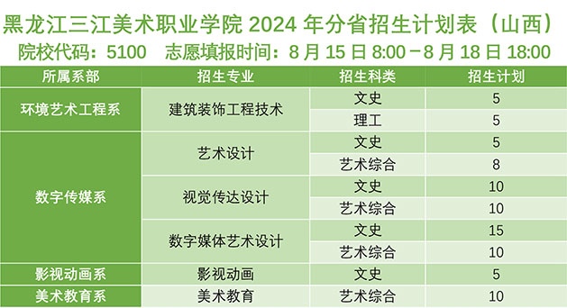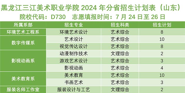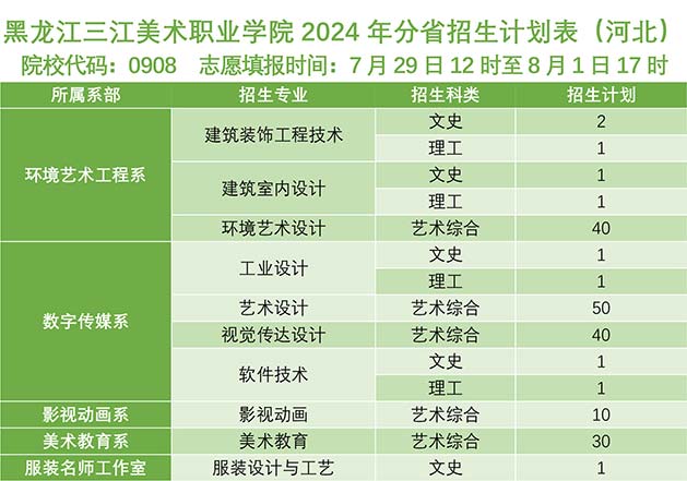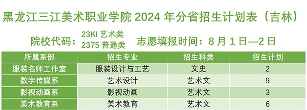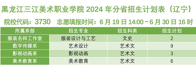 黑龙江三江美术职业学院是经黑龙江省政府批准、教育部备案、隶属于黑龙江省教育厅领导的一所集美术教育、环境艺术工程、数字传媒、影视动画、IT信息、国际国内专升本、专升硕为一体的国家普通高等学校,是黑龙江省唯一纳入国家招生计划、具有国际特色的美术高等职业学院。