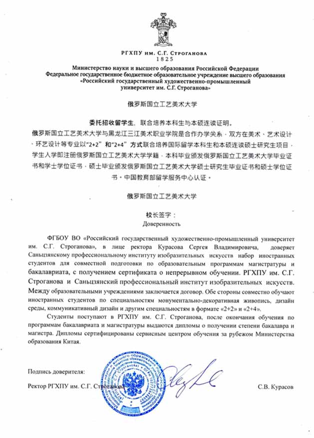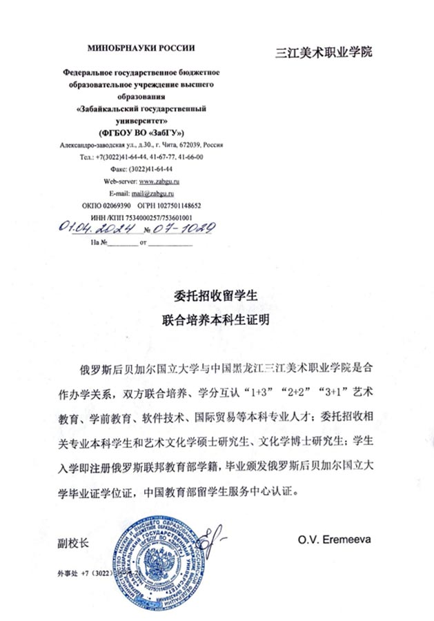 4、国际全日制本科。中俄“2+2”与“3+1”国际全日制本科,学生入学即注册俄罗斯大学学籍,在完成国内学习内容后,到俄方大学学习1年或2年。毕业由黑龙江三江美术职业学院颁发普通大专毕业证书,由俄罗斯后贝加尔国立大学颁发本科毕业证和学位证,中国教育部留学生中心认证,国家承认学历,享受海归待遇。本科毕业后,自愿申请硕士研究生学习深造。