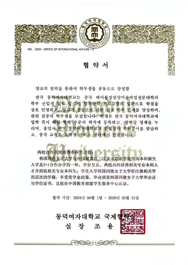 5、国际全日制本科。中韩“3+1”国际全日制本科,学生入学即注册韩国大学学籍,在完成国内学习内容后,到韩方大学学习1年。毕业由黑龙江三江美术职业学院颁发普通大专毕业证书,由韩国灵山大学、韩国同德女子大学颁发本科毕业证与学位证,中国教育部留学中心认证,国家承认学历,享受海归待遇。本科毕业后,自愿申请硕士研究生学习深造。