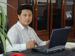 朱德峰,1969年出生在黑龙江讷河市的一个偏僻小村,从小他就对画画情有独钟。他儿时的梦想就是长大了当一名画家,可天不随人愿,高考时因文化课而使他失去了进美院学习的权力。无奈他选择了土建专业,但画画好像有种魔力时刻吸引着他,当时家里虽然很穷,但深明事理的父母还是东借西凑地为他准备了进修美术的费用,经过多方面咨询,他最终选择了当时的佳木斯三江美术学校。从此,三江美校同他结下了不解之缘。学校那时还处在发展阶段,条件很差。但是,他十分幸运的是遇到了一位严师--三江美术学校的校长王英海老师。王老师不仅教他美术的基础知识,还以自身的经历教育他怎样做人,做对社会有用的人。通过几个月的学习,他接触了除了绘画以外的多种艺术形式,对艺术有了新的认识,他的艺术感觉也进入了一个新的领域。"好男儿志在四方,走出去吧,只有在社会实践中才能领悟到课堂以外的东西。"带着老师的祝愿,他又回到了儿时的家乡。在家乡的小镇上办了一家美术社,他边做边学,不到二年,在当地就小有名气。经济上的宽裕没有让他感到满足,他觉得自己的视线不能总停留在这个小镇的范围。于是,在别人的疑惑中他毅然踏上了南去的路途。他到了河北,去了安徽,最终来到了山东嘉祥县石雕总厂。石雕厂的领导经过几天考察,非常欣赏他的为人以及事务处理的能力,将他留了下来,成为厂里设计室的一名设计员。雕塑不等同于绘画,但有些语言是相通的。在这陌生的艺术领域,他凭着真诚很快就与设计室的同伴打成了一团。这些伙伴们都是他内心中的老师,他白天同伙伴们一起设计模型,晚上又共同探讨雕塑设计中的问题。接触的事多了,眼界也宽了,在这里他把美校所学的知识巧妙地应用到实际工作中,使他设计的雕塑小样,得到了厂领导和客户的好评。工作给他带来了快乐,雕塑也已经溶入了他的生命,成为他生活中不可缺少的一部分。他感悟到:"雕塑是立体的诗,凝固的画,永恒的乐章",他深深地爱上了这一行。带着这种对行业的爱,他就对设计如何与市场相结合的想法同厂领导进行了长时间的交流,他的方案得到了厂领导的认可,同时厂领导也发现了他的管理才能,不久就被调到总厂业务科,他从业务员干起,全国很多城市都留下了他的足迹。"宝剑锋从磨励出,梅花香自苦寒来"。功夫不负苦心人,经过几年的努力,他的业务不断扩大,成了厂里的业务骨干,被提拔为厂里主管业务副厂长。身上的担子重了,压力也就大了,他感到了自身知识上的欠缺,于是他在进修经济管理的同时又自学电脑设计,使其自身的修为进一步地得到了加强。1999年,他再次回到母校。学校的变化使他不敢相信自己的眼睛,幽雅的校园、多种专业、庞大的师资队伍、广阔的生源,使三江美术学院早就跨入了全国民办先进学院的行列。没变的是他的老师,现已是三江学院院长的王英海先生,王老师依然是那么清瘦、儒雅,十年了,为了学院的发展,王老师的鬓角过早地出现了少许银丝。得知自己学生的在外发展的很好,王老师非常高兴。他在老师的带领下,参观了美院的各个科系,最后就雕塑系毕业生分配事宜达成共识,每年嘉祥石雕总厂接受美院毕业生10-20人。这样,既为毕业生找到了就业途径,也为厂里的设计队伍注入了新鲜的血液。