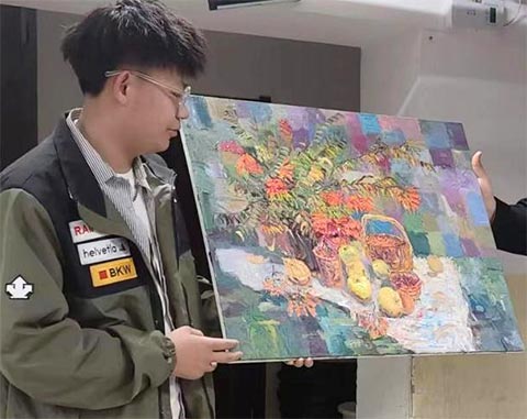 美教系学生刘天宇的作品是《静物写生》。他运用了点彩、刮刀等绘画方式进行创作,后面的花布比较花,运用了灰色调。不足在于后面的花布太死板,前面的花用刮刀画的,比较具有厚重感,水果是用小笔触画的,更加丰富,前面的桌面也是运用刮刀进行丰富的。
