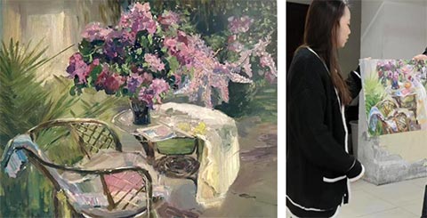 下面,让我们欣赏美教系同学安月的作品展示《静谧花园》。他介绍说:刚开始进行起稿阶段,可以用单色的油画颜料,也可以用铅笔进行起稿。要把构图确定好,具有空间感,主次明确,用大笔快速的把画面的色调捕捉出来。以概括的手法进行铺色,体现出光色的气氛,明确画面的各种色彩对比关系。在铺完大色调以后,我们就要进行不同物体细节的塑造,来表现不同物体的明暗关系和色彩关系。这个时候一定要从远到近来进行,要注意画面的空间关系,多减少补,达到画面关系的和谐。当细节都塑造到位以后,需要对画面有整体的检查,最后把画面进行整体的调整,直到完成。