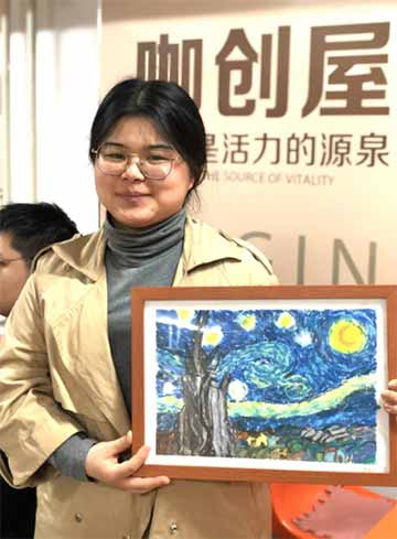 星空繁杂,包罗万象。钱怡鸣同学带来了临摹作品,通过临摹梵高的星空作品,不仅表现出对自然美的一种赞美,也抒发了其内心情感,从这幅临摹作品中我们可以看出这位同学在平日学习生活中一定是一个有耐心的人,由一点一点的笔触逐渐变成一幅画,可见其认真。