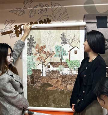 张鑫雨同学让同学们欣赏的作品是写生国画,整幅作品以暖色调为基础,土墙砖瓦等元素生动形象突出其特点,简约而又不单调的配色使得整幅画面十分和谐,充满乡土气息。