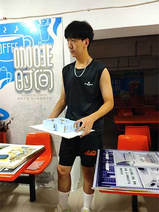 张文博同学带来的作品是立体构成课上制作的房屋模型,建筑空间作品划分出了两居一卫的空间形式,用模型材料制作出了居室空间中的家具,如沙发、床、柜等物品。通过精心合理的设计摆放,构成一个简约而不简单的居住空间环境。