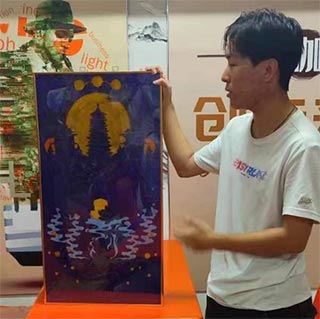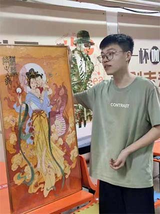 刘坤恒同学的作品是“掐丝珐琅彩”作品,他先介绍了什么是“掐丝珐琅彩”,“掐丝珐琅画又叫掐丝珐琅彩画、景泰蓝画、彩沙工艺画,是一种手工艺术品,它和传统的景泰蓝镶嵌工艺密切相关,我创作的这幅作品叫麒麟送子图,在中国神话传说中,麒麟为仁兽,是吉祥的象征,能为人带来子嗣。整幅图的主色调以暖色为主,在暖色中有着颜色的渐变效果,再加上蓝色的衣服形成这种冷暖搭配的效果”。
