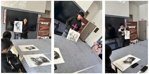 首先由来自23美教4班的邱冰同学带来了一副素描作品——《新时代女青年》,该作品塑造了女青年活力的形象,通过其眼眸以及对其五官的刻画,生动形象的体现出新时代青年意气风发以及对未来充满希望的一个鲜活的形象,让观赏者们能过深刻的体会到人物的青年活力,并且通过一系列的细节刻画和勾勒,使该女青年对未来充满希望的形象跃然纸上,让人赏心悦目。