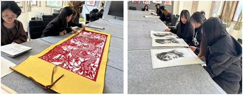 ▲美术教育系学生宁新展示他的作品《龙楼凤城》