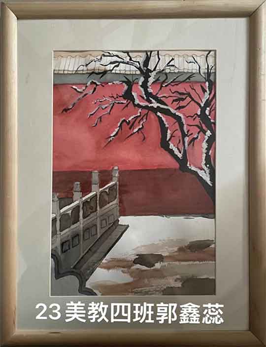 接下来为我们分享的是来自23级美教四班的郭鑫蕊同学,她为我们带来的是一幅水彩画名叫《故宫之雪》,这幅画描绘的是故宫雪后景象。郭鑫蕊同学先是用铅笔起稿,然后进行上色,创作灵感是古老浪漫的一场故宫雪,梦回紫禁城是故宫的红墙白瓦,庄重典雅、有雪相伴、落雪无声中、让人沉醉。作品要表达故宫在银装素裹中的美丽画面与冬日故宫的冷艳之美。她想通过这幅画表达中国古老文化的底蕴和历史的积淀。