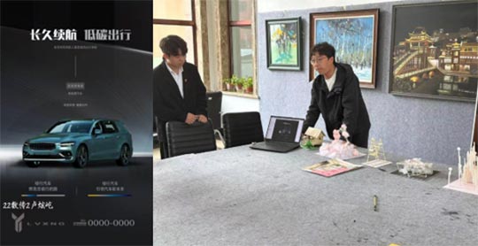 22级数传二班的卢炫屹同学带来的是一幅海报设计作品。这幅作品是他们学习小组共同完成创作的,作品以汽车绿色出行为主题,创作过程中以品牌汽车的基本元素作为参考,将中华元素相融为灵感。该汽车品牌,秉承着绿色出行的理念,同时还相应的创作了该汽车品牌的周边作品。