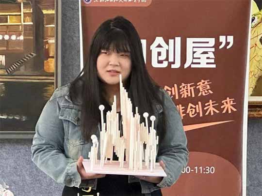 23级环艺一班的曹禹晗同学带来了她的作品——《梦幻》,该作品的底板是白色kt板,上面使用了白色泡沫球和白色纸吸管粘合而成,因为直线给人坚定和稳定的感觉,在空间中的排列组合来创造三维形态。这种设计方法可以创造出具有深度感、角度、方向、间隔、距离等元素的变化,可以产生不同的视觉效果。