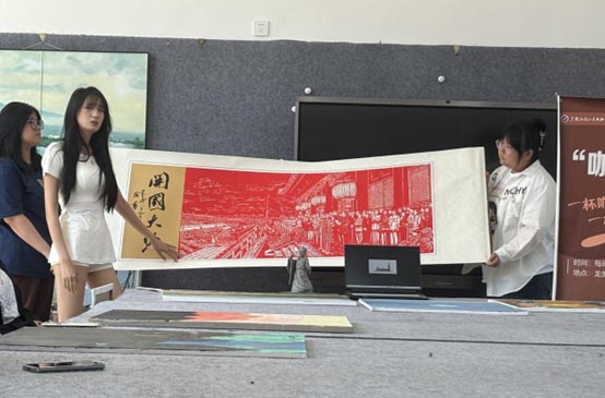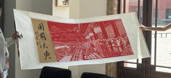 接下来的作品《开国大典》是来自于23数传1班徐艺瑄同学的一幅剪纸画卷。这件作品展现了徐艺瑄同学六年学习剪纸的成果,她通过生动、大气和震撼的表现手法,将这一重要历史时刻呈现在同学面前。徐艺瑄同学运用细腻的剪纸技巧,将开国大典的场景刻画得栩栩如生。她巧妙地利用剪纸的线条和层次感,将人物的表情、动作和服饰细节都展现得淋漓尽致。观众仿佛能够感受到当时人们的激动和自豪之情,仿佛置身于那个庄严而庄重的时刻。她还通过精心构思和布局,将开国大典的宏大场景和壮丽景象完美地呈现出来。她运用剪纸技巧,将天空中的彩旗、人群中的欢呼声和建筑的宏伟都融入到作品中,营造出一种庄严肃穆的氛围。观众仿佛能够感受到当时的庄重和庄严,仿佛置身于那个令人心潮澎湃的时刻。