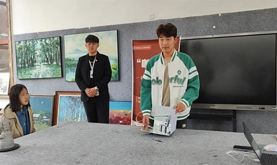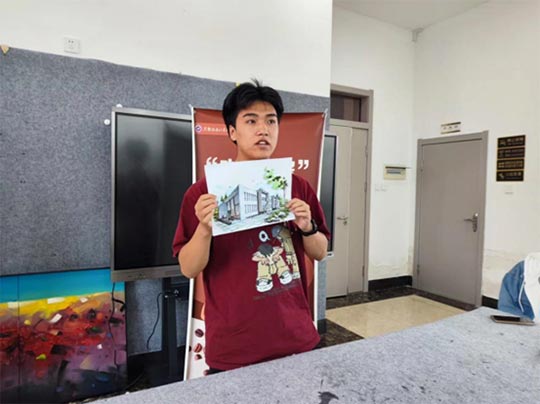 接下来分享的同学是来自23环艺三班任俊峰同学,一张手绘作品展现于他的手中,这是学院“明德楼”设计手绘效果图。作品运用两点透视,使画面具有立体感和空间感。实现了人物、物、环境三者相结合,给观者强烈的视觉冲击。从铅笔勾勒草图,在用勾线笔描绘,最后再用马克笔上色。看似三个步骤非常简单,但实际操作还是比较难的,在老师的指导下,草图加入了一些主观的思想和理解。马克笔上色阶段,选用了适合这幅画的颜色进行上色,先用浅色打底最后再用深色统一上色。该作品2024年在绚丽年华第十七届全国美育教学成果展中获得学生作品“二等奖”、2024年“国青杯”全国高校艺术设计作品展中获得学生组“二等奖”、2024年艺蕴中国·艺术教育创新成果展中获得获得学生组“金奖”。