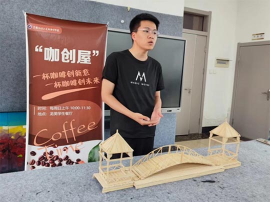 23环艺四班国浩博同学展示了他带来的手工作品。作品使用木棒来进行粘接,创造出亭桥连接的造型,它不仅是一次艺术创作的尝试,更是对和谐与合作精神的生动诠释。桥,作为连接两岸的重要元素,象征着沟通、交流与融合,它承载着人类对于和谐共处的向往和追求。在建造这样一座坚固的亭桥时,每一根木棒都扮演着不可或缺的角色。它们有的作为桥梁的主要支撑结构,承受着桥面和行人的重量;有的则作为连接亭子的横梁或立柱,确保整体结构的稳定性和美观性。这些木棒需要相互协调、密切配合,才能共同支撑起整个亭桥的造型。这座亭桥不仅是一件艺术品,更是对人类合作精神的赞美和颂扬。它提醒我们,在面对困难和挑战时,只有团结协作、共同努力,才能取得最终的成功。同时,它也鼓励我们在日常生活中,积极寻求合作的机会,与他人携手共进,共同创造更加美好的未来。