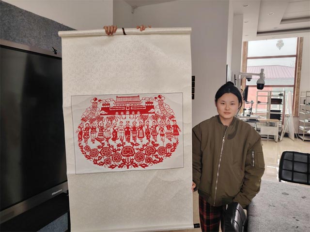 首先展示的是美教系四班的刘雨崴带来的剪纸作品。她运用了精湛的剪纸技艺,线条流畅,造型细腻。画面中,身着各民族服饰的人物手挽着手心连心,生动地体现了我国各民族之间的团结与友爱。这些人物姿态,象征着各民族紧密团结在一起,共同为实现中华民族伟大复兴的中国梦而努力奋斗。背景中的天安门高大雄伟,以杰出的建筑艺术和特殊的政治地位为世人所瞩目。画面四周的花团锦簇,为作品增添了生机与活力。通过巧妙的画面组合和元素设计,作品传达了“民族团结心向党”的深刻寓意。