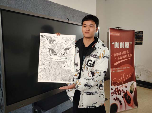 第三位出场的是来自24环艺系四班的王涵同学,他作品的名字叫《龙影下的少女》。这幅平面构成作品以少女与龙为主题,画面中少女处于中心位置,代表着勇敢与纯真,少女的形象细腻而生动,眼神中透露出对未知的好奇与坚定。背景中的龙威武霸气,象征着力量与神秘。龙的身躯蜿蜒盘旋,与少女形成鲜明的对比,同时也为画面增添了强烈的视觉冲击力。整个作品通过简洁的线条,展现出少女与龙之间独特的关系,传达出勇敢面对未知、探索神秘世界的精神。通过少女与龙的互动,王涵同学鼓励大家勇敢地面对生活中的未知和挑战,探索自己的内心世界和外部世界。同时也唤起大家对纯真和美好的向往,在现实生活中保持一颗纯净的心灵,追求自己的梦想和幸福。