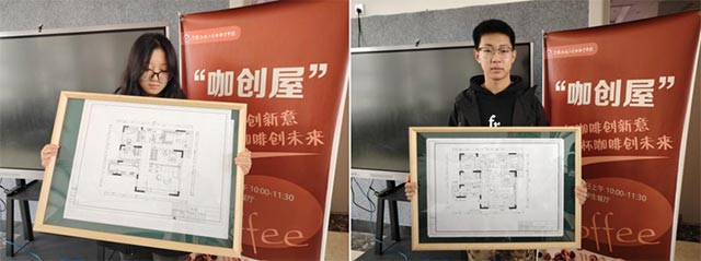 第四位是24级环艺5班两名同学:靳宇曦和马立博,他们展示的是装饰制图课程绘制的家居平面布置图。在装饰制图课程中,手绘家居平面布置图是一项至关重要的学习内容。以二维的形式,简洁而直观地展现了家居空间的布局和功能划分,是设计师将创意与实际空间规划相结合的初步呈现。手绘家居平面布置图能够准确地展示家具的摆放位置、尺寸比例以及相互之间的关系。通过合理的布局,设计师可以优化空间利用,确保家具的摆放既符合人体工程学原理,又能营造出舒适的居住氛围。手绘家居平面布置图是培养空间感和设计思维的重要手段,它不仅是一种设计工具,更是一种艺术表达和沟通方式,为创造美好的家居环境提供了有力的支持。
