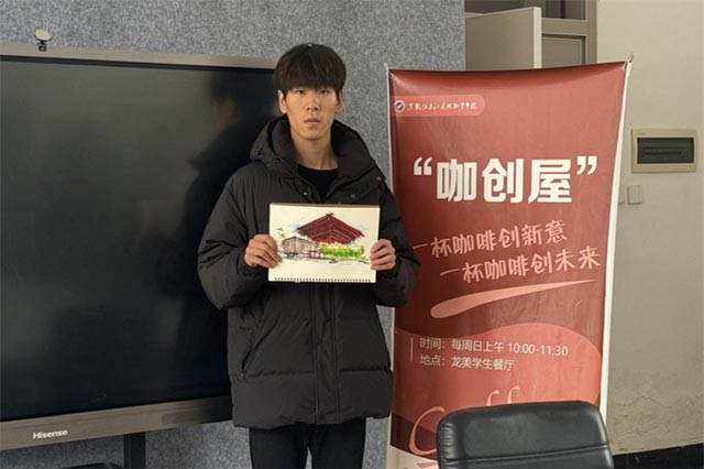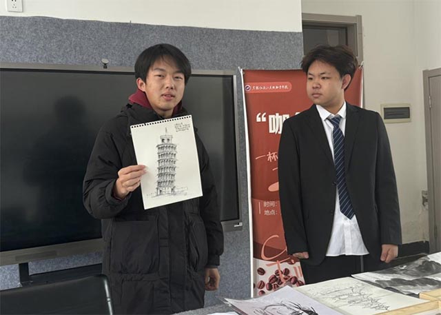 此次咖创屋由24数传一班金立蜀凡同学主持,以热情洋溢的艺术氛围拉开了序幕。他首先对到场的各系院同学表示热烈的欢迎,强调了“咖创屋”作为创意与灵感交汇之地的宗旨与目的,并鼓励同学们勇于展示自己的作品,介绍自己的设计理念与创作过程,作品涵盖了制图、绘画、平面设计、建筑速写等多个领域,共同探索艺术的无限魅力。