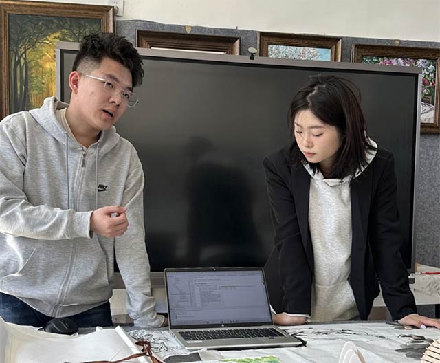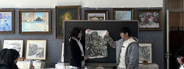 同样来自美术教育系的还有23美教4班陈磊、姚伊玟,23美教3班赵艺荣、刘金鑫,24美教班的陈佳、欧锡涵、王晨冉等人,她们分别带来了水彩画、山水画、漫画、剪纸等作品,绘画种类多种多样,展现了同学们乐善好学的创作精神。姚伊玟的剪纸作品主题是《同心共筑,中国梦》,篇幅较大,内容丰富,主题鲜明,更是将传统剪纸艺术与经典文学完美融合,让人不禁为其巧思与匠心赞叹不已。