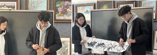 美术教育系23美教2班的袁华昌、刘宇航同学分别展示了他们的原创山水、花鸟画作品,袁华昌的《云壑松风图》通过层叠山峦与穿云松柏的布局,隐喻当代青年在压力环境中的精神坚守。画面底部断裂的栈道象征成长路径的不可预测性,与山顶完整的亭台形成希望对照。
