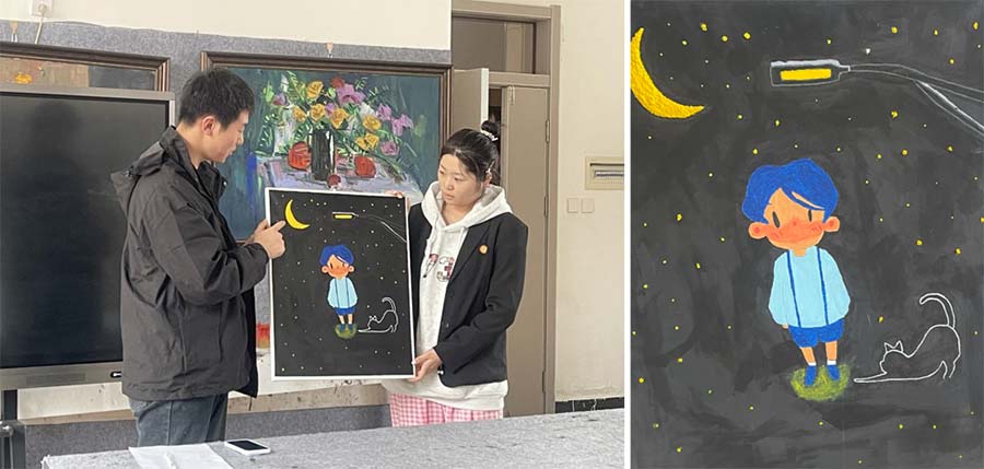 美术教育系 2024 级张浩然再次做客 “咖创屋”,带来画作《草间秘语》。他分享创作灵感时说,《草间秘语》捕捉自然环境中亲密而静谧的瞬间,以繁茂草丛为背景,营造隐秘而温馨的氛围。画面中人物姿态流露出情感交流,当我观察到露珠在草叶间折射阳光的样子,突然觉得自然本身就在诉说故事。我试图通过斑驳光影与人物微蜷的肢体语言,展现人与自然融合时的细腻情感。