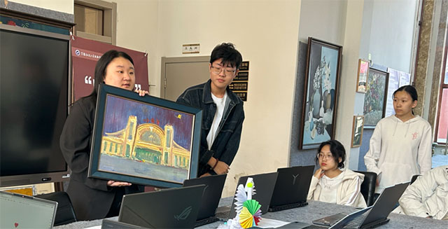 美术教育系王海宇的布面油画《哈尔滨站》以新表现主义手法完成对城市地标的图式转译。画面通过对新艺术运动建筑语汇的解构性再现,以几何切割的构图范式强化站房建筑的体量张力。在技法层面,通过多层罩染技法与明暗对照法的交互运用,精准还原铸铁穹顶的光影折射与拱券结构的装饰韵律。作品以具象表现主义视角重构城市记忆场域,既凝固了铁路建筑的技术美学特征,又通过色彩情绪引导完成对工业遗产文化价值的当代诠释。