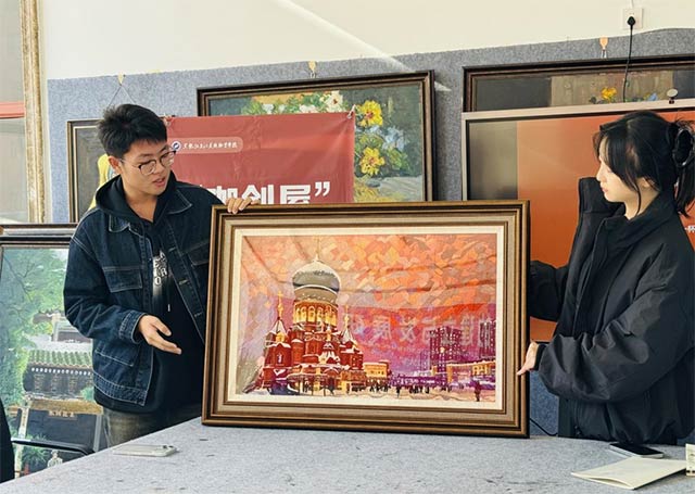 来自艺术疗愈与人工智能学院的王海宇同学展示了刺绣作品《圣·索菲亚》。这幅刺绣作品呈现了圣索菲亚大教堂在绚烂天空下的场景,装裱于精致的框架之中。整幅作品给人一种艺术与工艺相结合的美感,既展现了刺绣工艺的独特魅力,又传达出一定的艺术氛围,对于艺术疗愈与人工智能学院的学生而言,这是一件兼具技术展示与艺术表达的作品。
