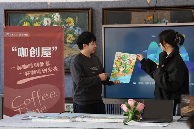 2025年11月16日,由我校学生处主办的第77期“咖创屋”学生作品交流活动在龙美书院一楼大厅如期举办。本活动旨在让学生敢想敢试,解锁不同的艺术风格,让不同学科的艺术灵感在此交汇,激发出超越想象的创作火花。作为学校重点打造的艺术交流的品牌活动,“咖创屋”以欢快自由的氛围吸引了中俄联合教育学院、设计与科技融合学院、艺术疗愈与人工智能学院、数字动画工厂、智慧建筑装饰工程学院等多个院厂学生代表的参与,现场满目皆是灵感迸发的视觉盛宴,空气里都跃动着创意的分子。
