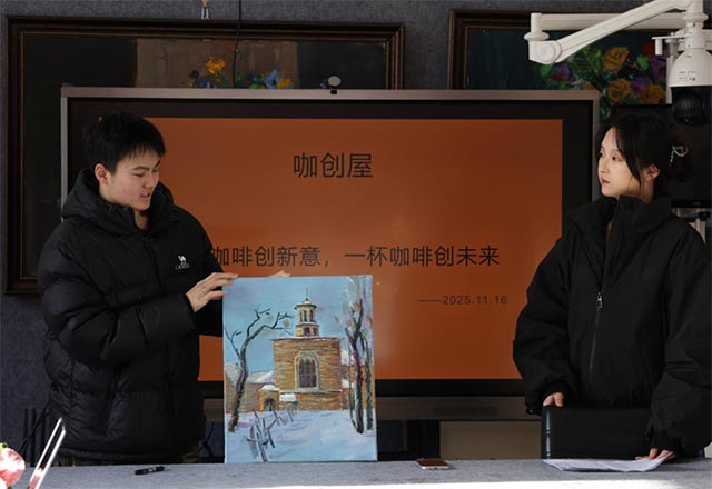活动最后,由中俄联合教育学院王镜冰老师进行总结。她说道:“咖创屋宛如一座桥梁,成功连接起了设计与科技的多元领域,每一幅都藏着满满的创意与心意,特别让人惊喜!整体来看,作品类型丰富多样——有勾勒生活瞬间的素描速写,色彩斑斓的水彩、油画创作,充满巧思的手工装置,还有融入个性表达的数字绘画、漫画设计等。大家不仅大胆尝试了不同的工具与技法,更在作品里注入了自己的观察、想象和情绪:有的聚焦身边的人和事,细节里满是生活温度;有的脑洞大开,用奇幻的画面构建专属小世界;还有的通过色彩和构图传递内心的思考,感染力十足。每一幅作品都是大家用心创作的成果,能感受到大家对美术的热爱与探索欲。希望大家继续保持这份创造力,大胆尝试、尽情表达,未来一定会有更多精彩的作品!