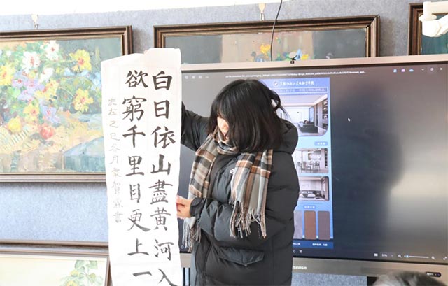 艺术疗愈学院健康产业学院的袁贺霖同学带来作品《智永楷书集字·王之涣〈登鹳雀楼〉》,以“古帖新用”为理念,依托隋代书法家智永的楷书风格进行集字创作。作品采用方格竖排的传统形制,缺字部分通过“部首重组法”巧妙补全,保持了整体风格的统一协调。其中“黄”字结构匀称、“河”字笔断意连、“海”字线条劲健,在传承楷书法度与笔意之余,也为学习者提供了从临摹过渡到创作的实用范本,有效降低了书法实践的门槛。