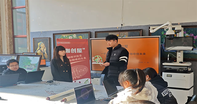 2025年11月30日,由我校学生处策划的第79期“咖创屋”学生作品交流活动,在龙美书院一楼大厅如期举行。作为学校重点打造的艺术交流品牌活动,“咖创屋”始终秉持“让学生敢想敢试,解锁不同艺术风格,让不同学科艺术灵感交汇碰撞” 的核心宗旨,如同一块充满磁力的创意磁场,吸引了来自艺术疗愈健康产业学院、设计与科技融合学院、智慧建筑工程学院、中俄联合教育学院、数字动画工厂等多个院厂的学生代表踊跃参与。屏幕上“一杯咖啡创新意,一杯咖啡创未来”的标语格外醒目,为这场创意盛宴奠定了自由灵动的基调,每一处角落都洋溢着灵感迸发的活力。