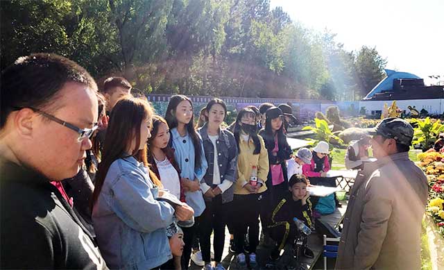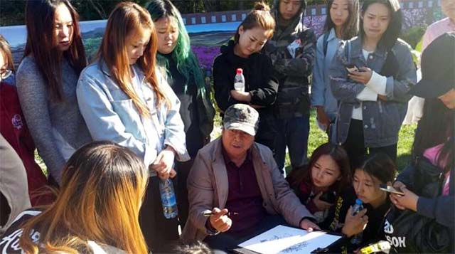 把水源山公园作为写生基地,是由王英海院长亲自挑选的。它是一处十分适合写生的艺术圣地,并且眼下很荣幸赶上了公园正在举办菊花展。在参观菊花展过程中,同学们有幸见到了学院党委副书记、知名国画家姚宝山教授和山水画院姜修润院长。在向姚老师学习的过程中,能够深深的感受到他那扎实的绘画功底和深厚的国画实力。
