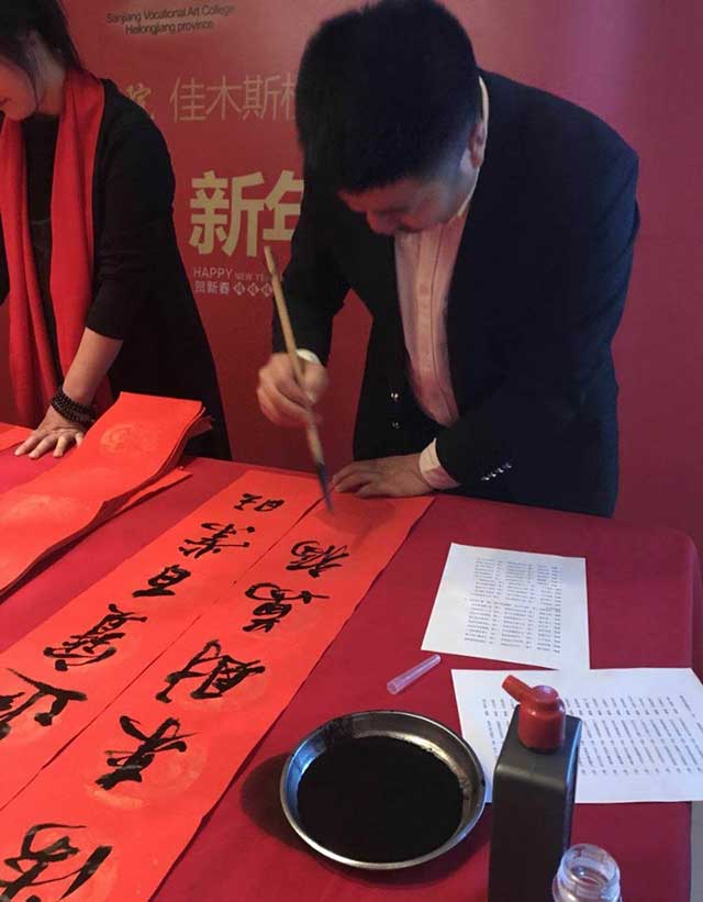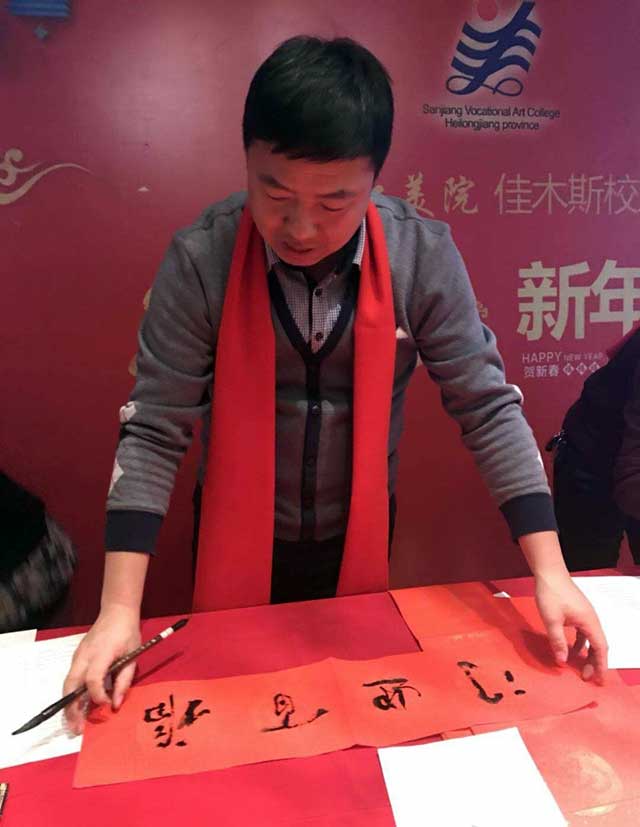 三江美院综合艺术专业89届毕业生、佳木斯大学商学院教师李树亮,93届毕业生、远航书画培训学校校长高战及夫人,86届综合美术班毕业生、国画家姚宝山,室内设计专业97届毕业生、佳木斯龙江装饰工程有限公司总经理季龙江,装潢艺术设计专业89届毕业生、哈尔滨剑桥学院教育学院副院长马世伟等校友除了在美术教育、艺术设计等领域有所建树、功成名就之外,在佳木斯市乃至全省书法届也都是声名赫赫的人物。他们也纷纷拿起毛笔,投入到春联的创作之中,同时也表达了对培养他们成长、成才的母校——三江美院的恩师的无限感激之情。