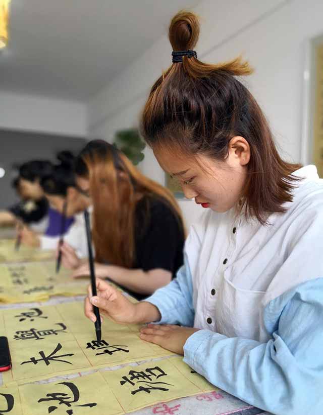 接下来的两周时间,我们去陈绍禹教授的承贤书馆学习书法,让我们体会到运笔太极般的节奏与力量。我们开始练古诗绝句与春联的创作。每天我们都仔细认真的写例字,并从中总结书法的运笔以及手腕的旋转手法。陈教授在我们写字写烦躁的时候,会给我们讲古代书法的故事,也会给我们介绍书法大师的作品和典故。我们在写例字的时候陈教授总是在一旁耐心指导。