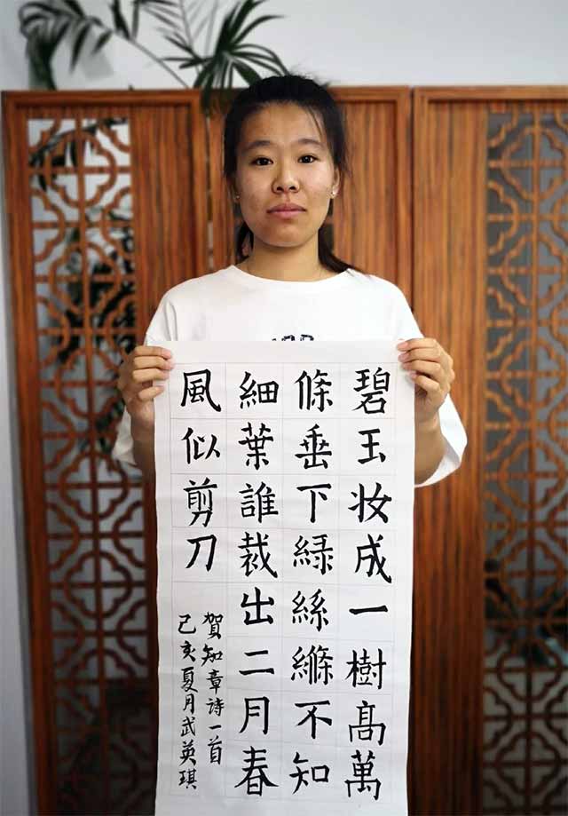 第三个去的是陈绍禹教授的工作室,去那里学习书法。陈教授的书法作品可谓是宛若蛟龙,提笔、转折一气呵成。看见陈教授工作室墙上挂着他写的作品,有时会想,我什么时候才可以达到陈教授那种境界啊!陈教授说过,学书法不能急于求成,还是需要时间去练习,一点点积累。我相信,只要我努力,时间不会太久。我们在练习时,陈教授总会在地上一遍一遍地走,看我们写的字,帮我们纠正错误,或者帮我们写几个例字。每次陈教授给我写完例字,我便会拿老师的字与我的字做对比,看错出在哪,继续练习。