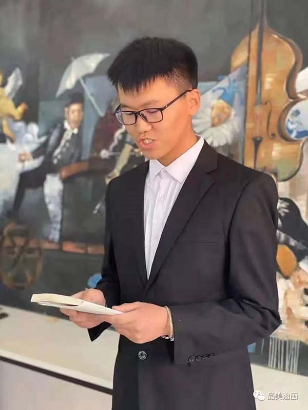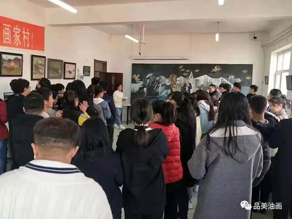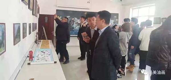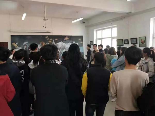 同学们在横幅上依次签上自己的名字。横幅上的名字不光代表学生的参与,更代表学生们那种求知的渴望。该院2019级学生一边欣赏师兄师姐们的作品,一边认真研究,仔细思考自身的不足,总结这次参观画展得到的收获。