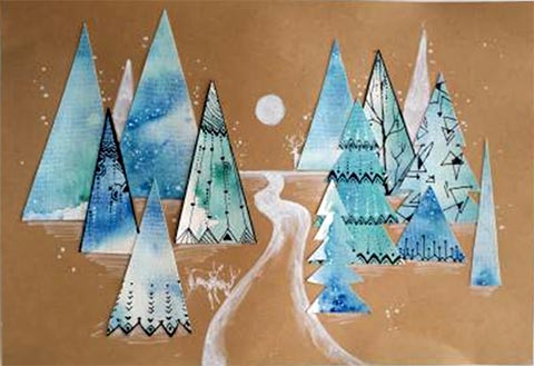 例如:第一幅创作是,水彩和几何形体的结合,其中学生会根据自己的创作和想法,运用一些其他的材料。