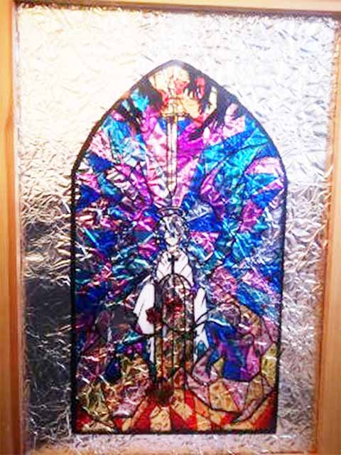第三幅创作是,主要这节课是带同学们认识,哥特式教堂玻璃窗的特点,利用特殊材料 锡纸,来进行肌理的表现,并让学生们结合神话故事来设计画面。