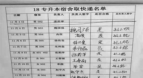 专升本班级的实际情况时,班级面积大,班级人数多,班级每天要取的快递数量也很多。基于这样的现实情况,我在班级公开选任了三名同学作为班级的事务负责人,一人负责管理班费,一人负责安排与监督值日,一人负责安排与监督取快递。具体做法如下:本班级的卫生以及快递都是以班级为单位进行,由于班级人数较多,每个寝室半个月才会轮到一次,寝室长是第一责任人,两名事务负责人每个月在班级墙上进行公布,完成任务后寝室长作为第一负责人要在上面签字,再由事务负责人检查合格后给出评价并签字。无论谁忘记签字,均视为没有完成任务,会接受相应的处罚。例如:再值日一天或抄写艺术概论的简答题等。如图所示: