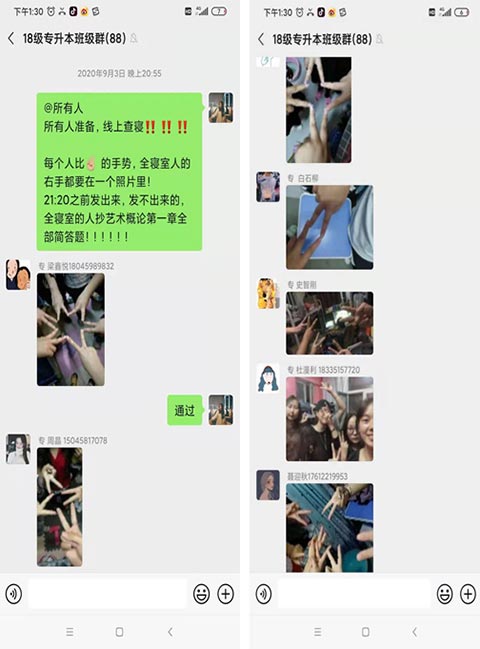 我会临时在群里发布消息,让学生比手势或者是拍小视频的方式,准时将照片发到群内,由于视频不好展示,就没有在此文中附图。这样我就可清楚的知道,是否有没有请假有离寝的情况。