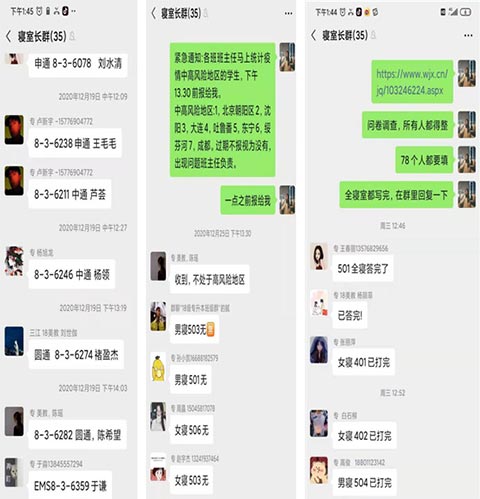 除以上提及的班级干部之外,专升本班级另有一个寝室长群,寝室是一个班级的最小组成单位,建立寝室长群主要目的是为了增快信息传达的速度以及增快信息统计的效率,能有确保我发的每一个通知在两分钟内,全班同学都能知晓。除此之外,每天的快递信息也都是由各个寝室长发到群里,方便当日去取快递的寝室进行统计,如图所示: