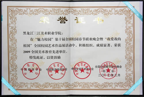 2010年4月,由主办单位中国教育学会、中国教育电视协会、中国文学艺术基金会、全国校园春节联欢晚会组委会联合颁发荣誉证书给黑龙江三江美术职业学院,该校在“魅力校园”第十届全国校园春节联欢晚会暨“我爱我的祖国”全国校园艺术作品展活动中,积极组织,成绩显著,荣获“2009全国美术教育先进单位”。 据悉,此次活动还得到了教育部关心下一代工作委员会、中国教育报、中国艺术报的大力支持。(刘 卓)