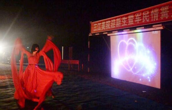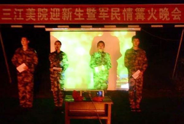 2014年9月24日,黑龙江三江美术职业学院佳木斯校区与来佳参加军训的哈尔滨校区师生和负责学院新生军训的教官在学院足球广场举行了盛大的“迎新生暨军民情篝火晚会”。