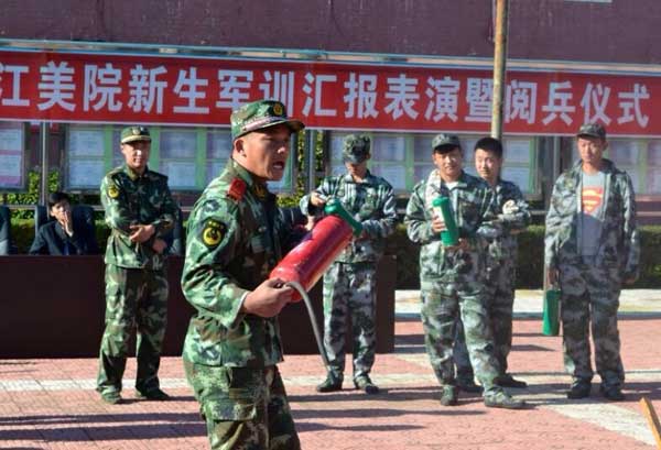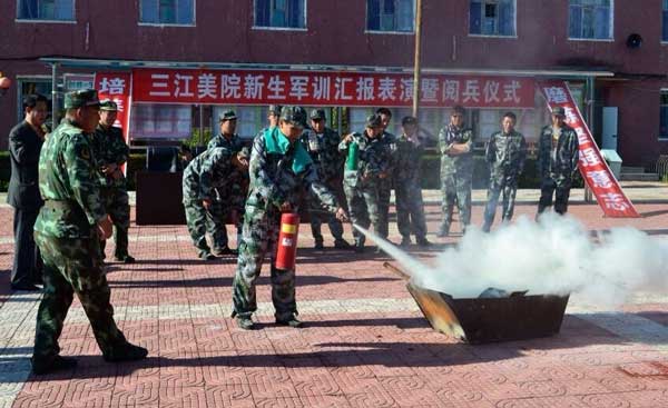 三江美院2014级新生刚刚接受了为期八天的军事训练,在教官的悉心指导下完成了队列、操练、内务整理等训练课目,进一步增强了同学们的组织性和纪律性,磨炼了意志,经受了考验,强健了体魄。严格、紧张的军训闭营式刚一落幕,新鲜刺激、震撼人心的防火知识讲座和消防演练马上开始。来自佳木斯市消防支队郊区大队的消防官兵以通俗的讲解、精湛的示范、过硬的技能为大学生们上演了一堂精彩的消防知识和防火演练课,使同学们受益匪浅。