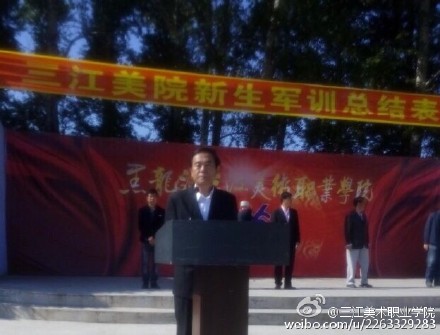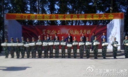 在这夏末秋初、天高云淡的季节里,我们黑龙江三江美术职业学院2015级新同学从四面八方汇集到祖国东方第一城黑龙江省佳木斯市,在这充满田园风光的校园里度过了二十天紧张、充实、难忘的军训生活,圆满地完成了预定的军事训练科目,使同学们经受了一次思想上、灵魂上和身体上的洗礼,实现了由一名高中生到大学生的跨越,完成了由一名稚气未消的青少年到初步具备军人素质的后备军人的蜕变。在此,我代表学院党政领导班子,向同学们勇敢地迈过了进入大学后艰难的第一步表示祝贺!向荣获军训标兵和内务标兵的同学们表示敬意和诚挚的祝福!三江美院为拥有你们这些优秀的大学新生而感到骄傲和自豪!