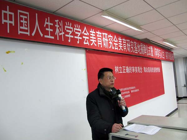 美育专题讲座开始前,首先举行了简单而热烈的“中国人生科学学会美育研究会美育研究基地”和“中国美育网北京服务基地”两块牌匾的揭牌仪式。在欢快的乐曲和热烈的掌声中,前来出席揭牌仪式的中国高等教育学会理事、美育专业委员会常务副会长、中国科学人生学会美育研究会副会长、中国人民大学博士生导师王旭晓教授、中国高等教育学会美育专业委员会副秘书长兼中国人生科学学会美育研究会秘书长、北方工业大学王文革教授和黑龙江三江美术职业学院院长王英海教授分别为“中国人生科学学会美育研究会美育研究基地”和“中国美育网北京服务基地”揭牌。