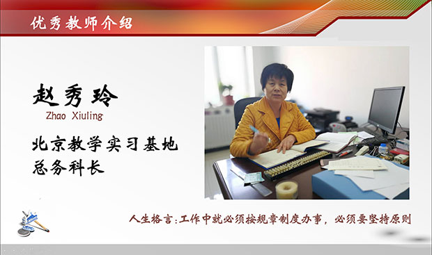 赵秀玲,三江美院北京教学实习基地总务科长。该同志在工作中兢兢业业,坚持原则,不怕苦累,坚持原则,严格按照学院和基地的各项规章制度办事。在她的精心管理下,北京教学实习基地的校产得到高效实用,为学院北京基地节约办学效益最大化做出了重要贡献。她在宿舍管理工作中精心计划,带领全体舍务老师坚持对学生进行安全、消防、控烟的日常教育和监督检查,严格管理学生宿舍的安全工作,在北京教学实习基地后勤保障、宿舍管理、财务管理等各项工作中都做出了突出成绩。