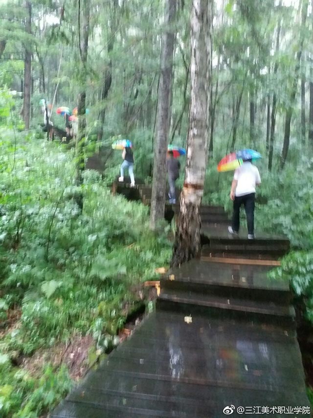 扶着简易的护栏,攀上如“羊肠”的小径,我们向第二哨所攀登。右侧是山体,左侧护栏外就是悬崖,雨中的山涧在山雾的环绕下深不可测。