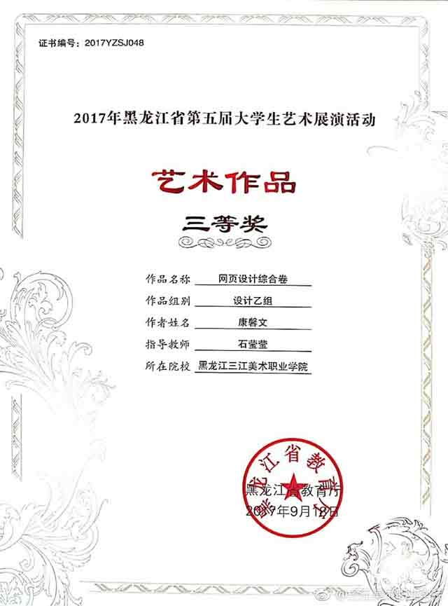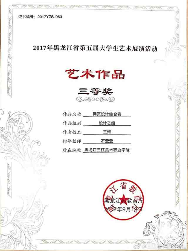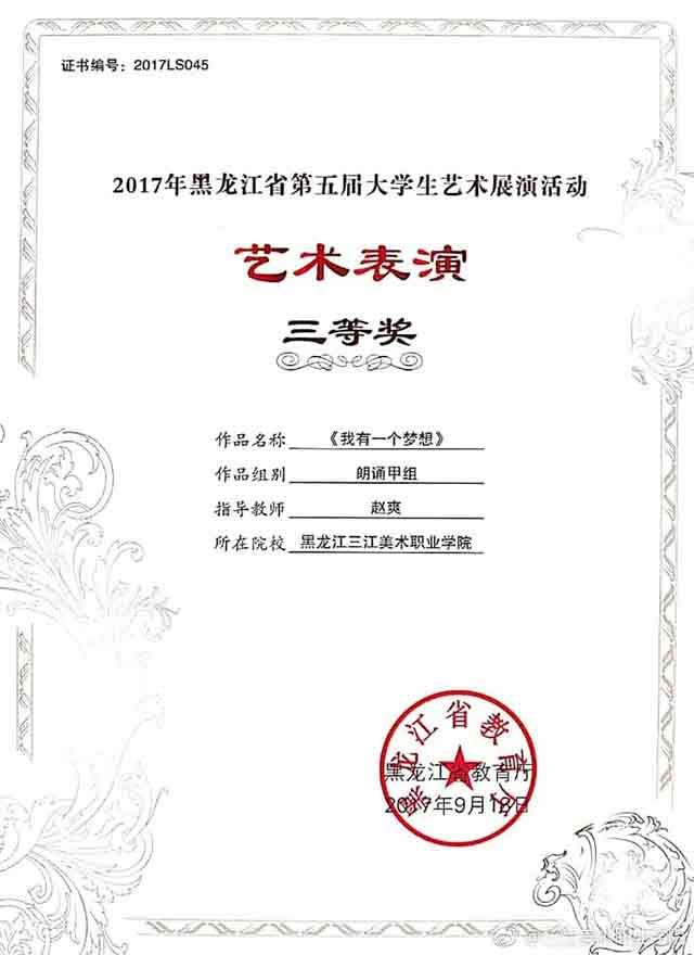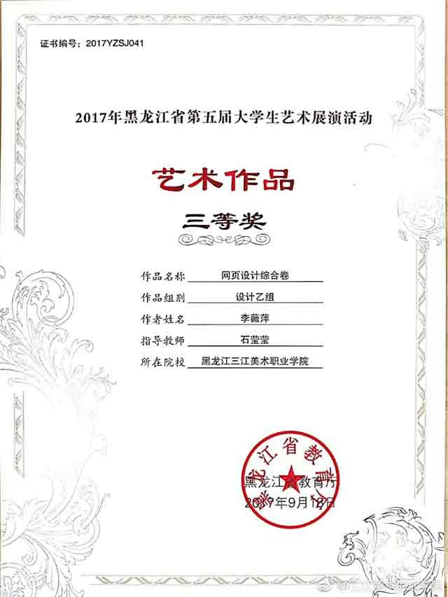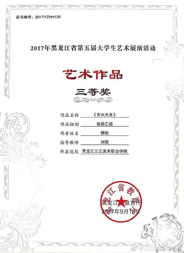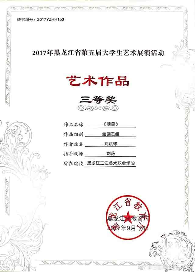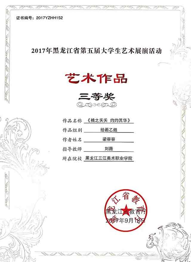 作为一名大一的学生,获得全省第五届大学生艺术展演活动艺术作品类绘画乙组三等奖,我感到很高兴,感谢老师对我的指导。这次取得的成绩,是对我在学习方面给予鼓励,我会在今后的学习中继续开拓思路,大胆创新,取得更好的成绩。
