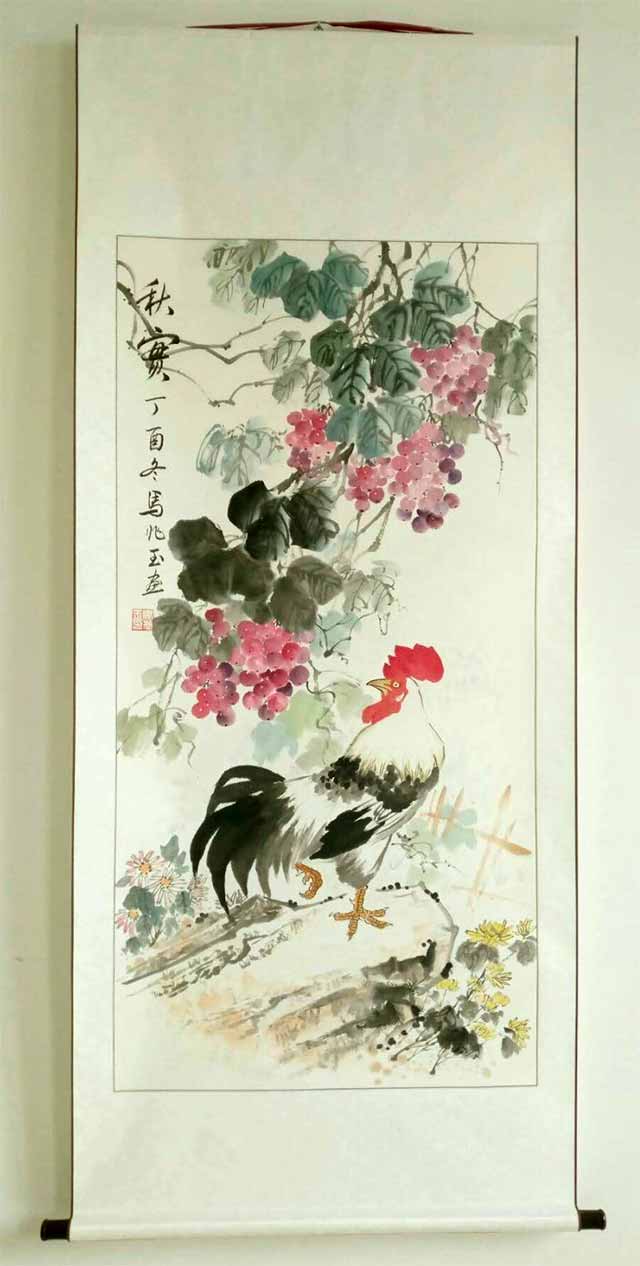 获奖教师马兆玉说:选择中国写意花鸟画《秋实》作为画面的主题,来表达深秋硕果累累的意境。在内容搭配上,选择了普通的农家最常见的场景,将葡萄、鸡和菊花作为素材纳入画面,表现出“鸡年”浓厚的龙江田园风情。在笔墨运用的技巧方面,以水墨为主,施以淡彩,使画面略显秋天的意境,在构图处理上“葡萄和鸡”形成一种相互呼应的关系。此次获奖,对自己今后的中国画创作,是一种鞭策和鼓舞,以此为动力还要不断的多出作品、出好作品。